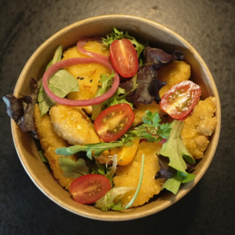 Réf. : 0012Roquette, Filet de poulet pané, féta, tomate, Pickles d’oignon rouge, légume de saison et sésame griller.